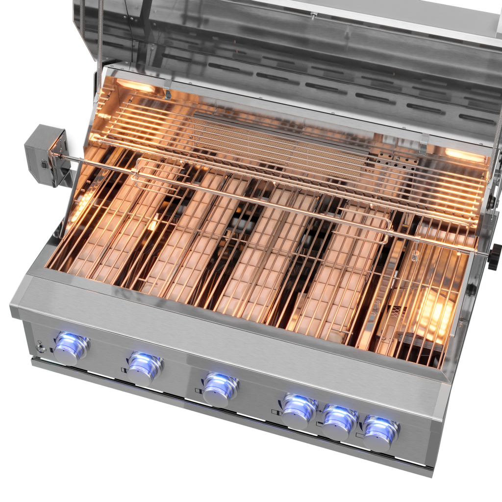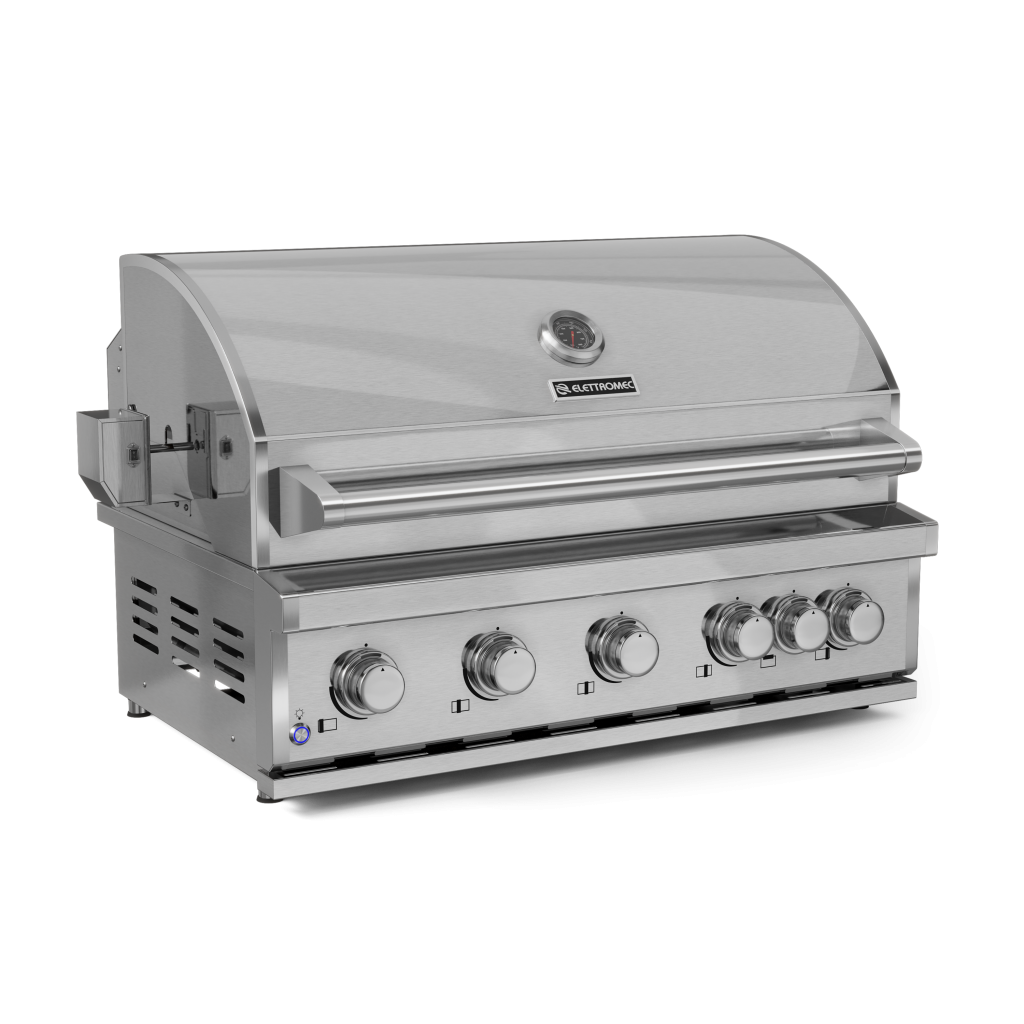 Construída em aço inox, une durabilidade, fácil manutenção e estética premium. A largura de 36” oferece área de cocção ampliada e a tampa com abertura de 105° garante melhor ergonomia e direcionamento da fumaça para a coifa. O design de embutir integra o produto ao projeto com elegância, elevando o padrão da área gourmet.