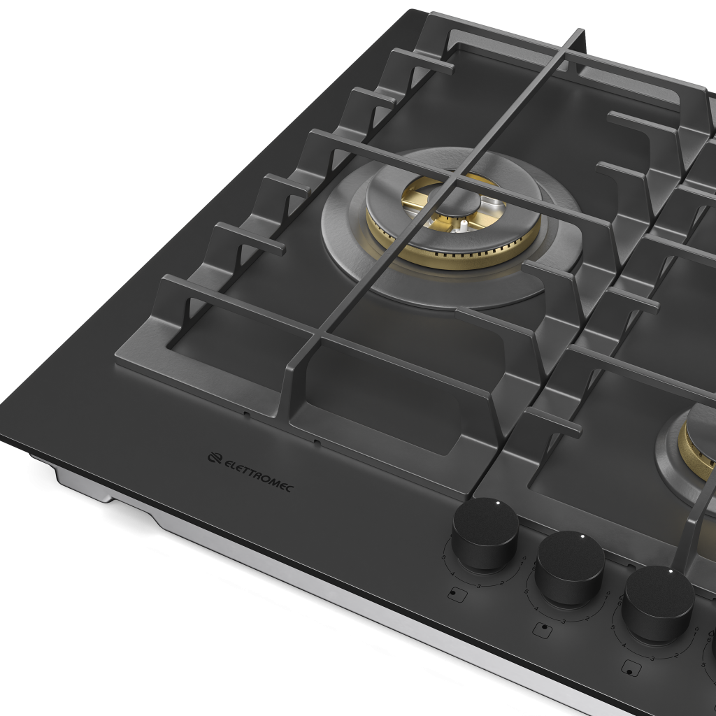 O acabamento Black Matte valoriza a estética da bancada e permite integração harmoniosa com diferentes estilos de cozinha. As trempes em ferro fundido garantem robustez e estabilidade para as panelas, enquanto os manípulos em zinco reforçam a elegância e a unidade visual do conjunto.