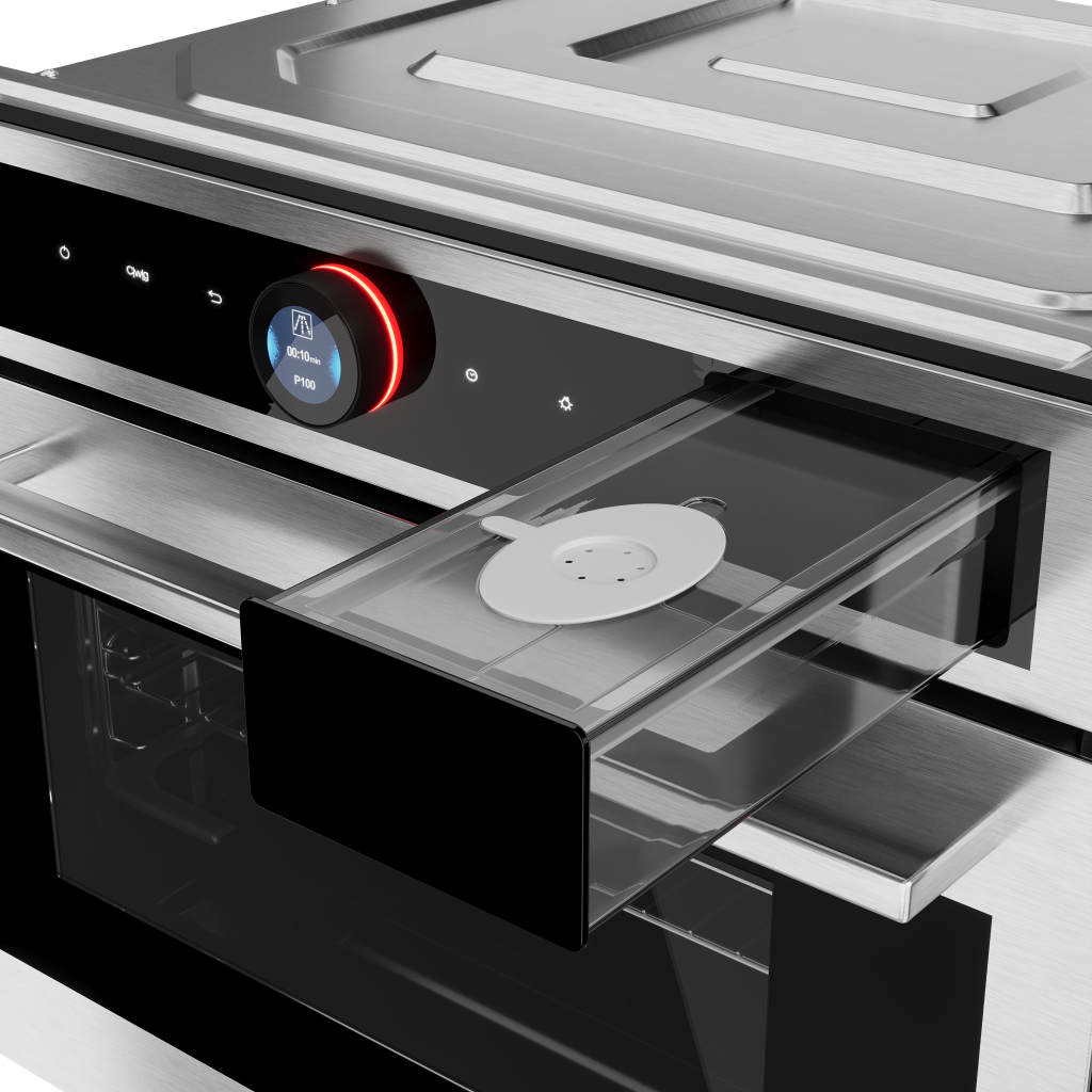 Com acabamento em inox e vidro, o micro-ondas apresenta estética sofisticada e fácil harmonização com diferentes estilos de projeto. O conceito Family Look Sole permite a composição da torre quente com forno, dispenser de água e gaveta aquecida, criando um conjunto visualmente integrado e elegante.