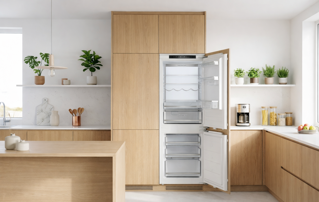 Compacto, versátil e sofisticado, o Refrigerador Bottom Freezer 237L para revestimento é a escolha ideal para projetos que valorizam integração e personalização. Discreto e funcional, adapta-se perfeitamente à marcenaria, elevando o padrão da sua cozinha.