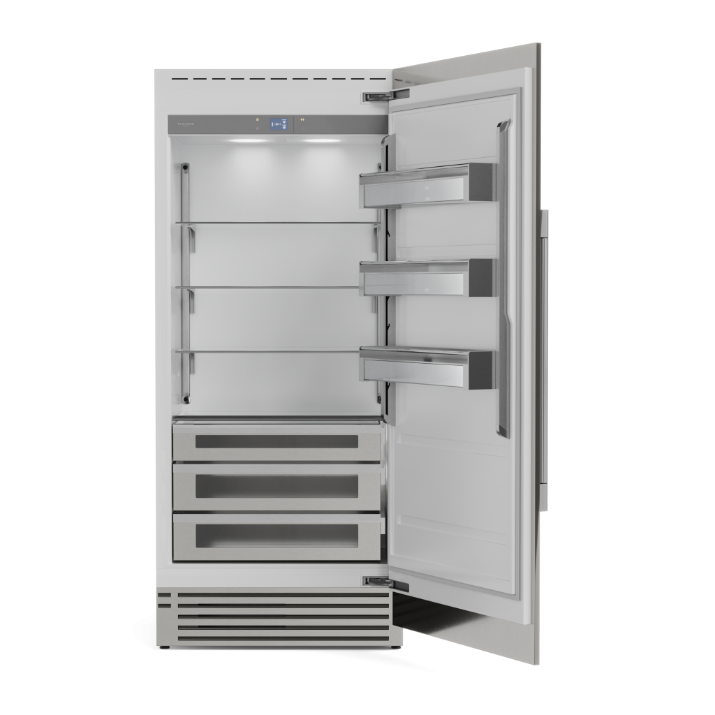 Os refrigeradores Built-In da Fulgor Milano são tão bonitos, quanto funcionais. Seus painéis personalizados podem ser instalados para fornecer uma aparência completamente integrada com armários lado a lado, além de apresentarem um interior de alumínio e branco brilhante com detalhes em alumínio escovado e aço inoxidável. Focados na preservação de alimentos, eles combinam design elegante e eficiência para garantir o mais alto desempenho e preservar a qualidade.